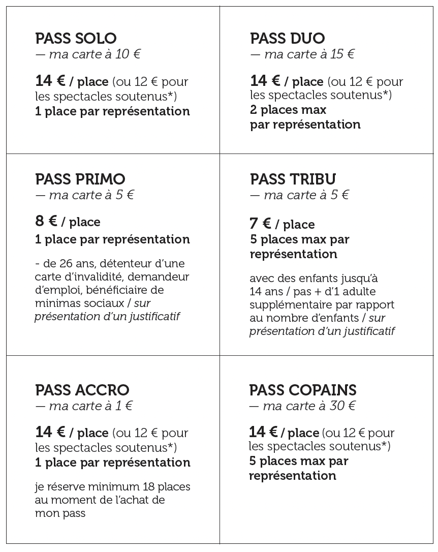 Des formules avantageuses et super pratiques ! Je profite de tarifs préférentiels toute la saison. Je peux échanger mon billet jusqu’à 48h avant la représentation, par téléphone ou au guichet. Je profite de tarifs privilégiés pour mes sorties dans les structures partenaires de l’acb ! (liste à retrouver en bas de page). Et en bonus, je soutiens ma scène nationale !