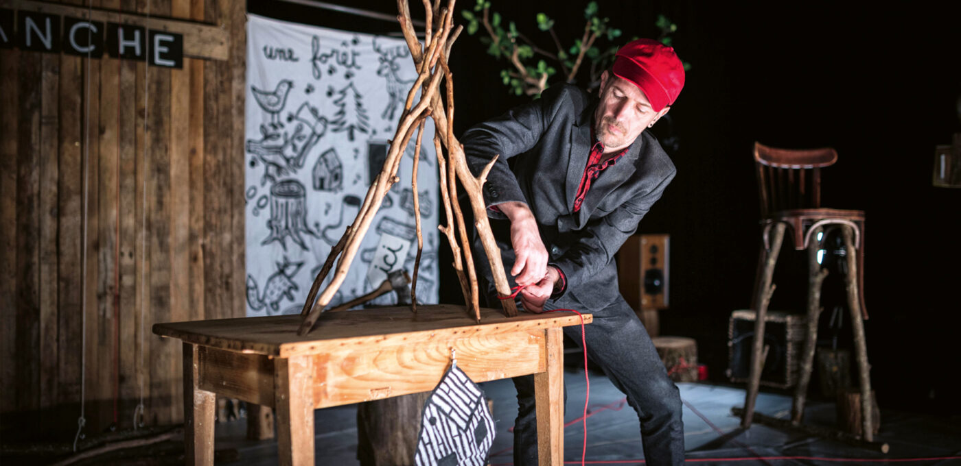 Une forêt en bois : construire est un voyage poétique et surréaliste où l’art brut rencontre la nature. Sur scène, un constructeur solitaire manipule des objets en bois et des fragments de forêt pour créer un monde fragile et en mouvement.